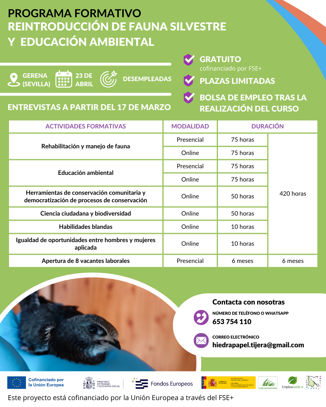Durante los meses de verano, el número de ingresos de ejemplares de estas especies es muy elevado y generar estrategias de contención que garanticen el cuidado y recuperación de estos individuos se ha convertido en uno de los retos principales para múltiples asociaciones de conservación en la provincia. Esta situación se repite a lo largo de toda la comunidad autónoma. El aumento de estas emergencias implica una demanda cada vez mayor de profesionales en este ámbito, así como mayores esfuerzos por parte de múltiples asociaciones para generar oportunidades de contratación en el sector. La creciente necesidad de profesionales en la rehabilitación de fauna, así como la mayor presencia de la educación ambiental en todos los sectores convierte este curso en una oportunidad profesional para las personas más desfavorecidas del ámbito rural andaluz.
